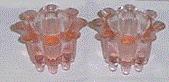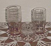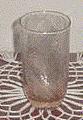 There are many other pink sets of glassware produced after the depression, to the present day. 3 other patterns are shown below. The glass to the far left is a very simple, with no design, just a straight up and down glass I found at a thrift store, it's 5 1/2 inches tall. The 2 in the center are a tumbler and a rocks glass. The tall one is 5 1/4 inches and the rocks glass is 4 inches tall. They are somewhat heavy. I bought these new at a MacFrugals store in the early 90's. They are marked with an L on the bottom. I've seen some like them for sale recently but the color is a more violet pink. The glass to the right has a tight swirl pattern. It's 5 1/4 inches tall. It's a very heavy glass but somewhat prone to tipping over. I believe this may be Italian glass but it isn't marked.