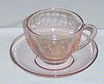 The cup and saucer pictured at left may not actually go together though they are both a plain design pink glass. The cup is 3 1/4 inches across and 2 3/4 inches tall. It's unmarked except for a 0. The only other numbered pieces I've seen were Vereco and Arcoroc. Perhaps the cup is a piece of French glass also. The saucer is marked Indonesia and is 5 1/2 inches across. I picked these pieces up at different thrift shops.