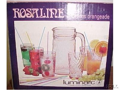 To the left is a pitcher. It's 8 1/2 inches tall. I bought mine at a discount store in the early 90's. It doesn't match the pink swirl glasses I had originally purchased. It does have a set of glasses that goes with it though. These are newer glasses that I believe were sold under both names. The newer glasses and the older glasses both have the swirls but the new ones don't have the little flared out section at the bottom like the older Arcoroc ones. The newer drinking glasses are often found on auction web sites, along with the wine glasses and the other stemmed pieces, which all seem to match. Below is a photo of one of the newer sets, the Luminarc Rosaline set in the box.