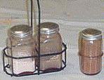 The canisters to the right are really neat. When I bought these I saw a tall one for holding spaghetti also, but didn't get it. Wish I would have. These are Italian glass and were purchased at an import store in Mesa, Arizona. I used them for flour and sugar for a long time but eventually the rubber seal wore out on the sugar and then the rim got rough, I stopped using them when I found a sliver of glass in the sugar.