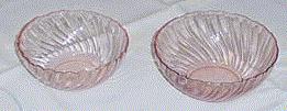 Often you can find surprises in unusual places when collecting pink glass. The bowl, shown to the right, is a really pretty one and the newest of the pieces shown here. I found these in a warehouse grocery store for $1.00 a piece in 1999. I have often wished I had bought more of the other pieces of glass that I purchased new in the 80's and early 90's. I made sure I didn't make the same mistake with these and bought 2 dozen of the bowls. We use them everyday with the Pink Swirl dishes. The Pink Swirl bowls are too small for my families appetites. These bowls are marked Indonesia and are 2 1/4 inches tall and 6 3/4 inches across. They have a pretty clear rose design on the bottom of the bowl. The sides are textured. With a husband and 4 boys, I've already lost a few of these rose bowls.