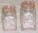 There are a lot of other new pieces that are out that aren't part of sets. To the right are 2 of the newer salt and pepper sets that are available now. There are many different new salt and pepper sets. There is a tall set that is reminiscent of the Princess pattern, chicken shaped, people shaped and the 2 pictured are some of them. I've seen both the sets at left with or without different holders. The single shaker was a set until one of my boys broke one. Now it holds the cinnamon. The square set is the one I use now. The square set is also reproduction piece, but there were depression glass shakers made in this pattern also.