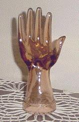 These small candlesticks are also new glass. In addition to many small new candlesticks available there are a lot of beautiful, very decorative ones. I've seen fish, angels and many other designs. There are also a lot of new animal figures made in pink glass, train sets, and animals on bowls in regular sizes and miniature ones. There are also toothpick holders, rolling pins and straw holders. Another interesting modern piece is the glass hand pictured below. It's for storing rings.